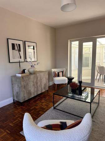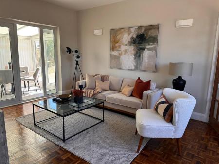 Spacious lounge with uPvc double glazed panelled bow window to the front elevation, double panelled radiator, wood block flooring, uPvc double glazed French doors leading into the conservatory, two wall light points, door into the study / bedroom three.