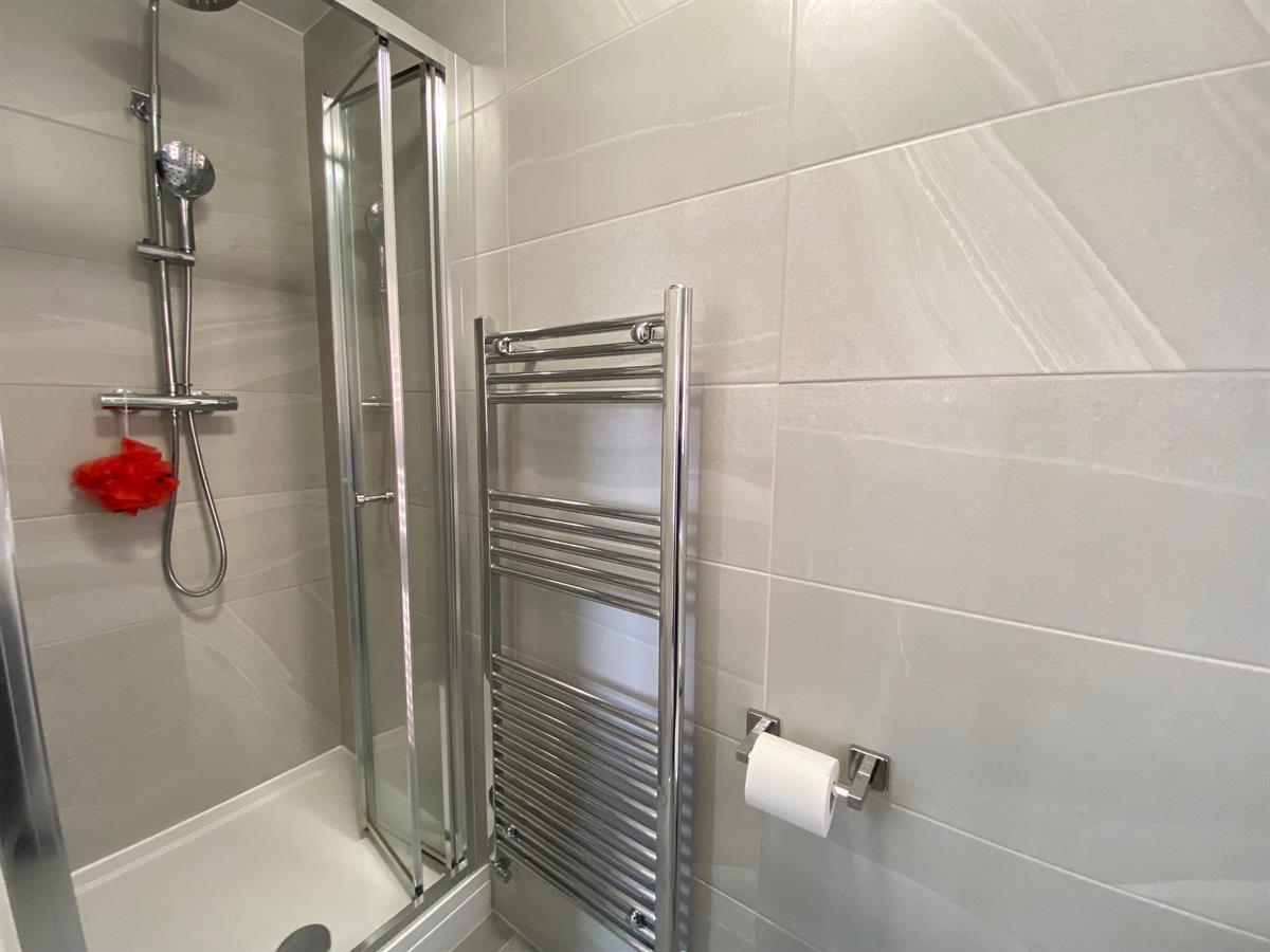 Having a uPvc frosted glazed window to side elevation and fitted with a 3 piece suite comprising vanity unit wash hand basin with mixer tap over and storage cupboard below, concealed cistern, low level, push button W.C., and a walk in shower cubicle with glazed pivot door housing a mixer shower with rainfall shower head and hand held attachment and heated ladder towel rail finished in chrome. Tiled flooring and tiling to walls where visible.