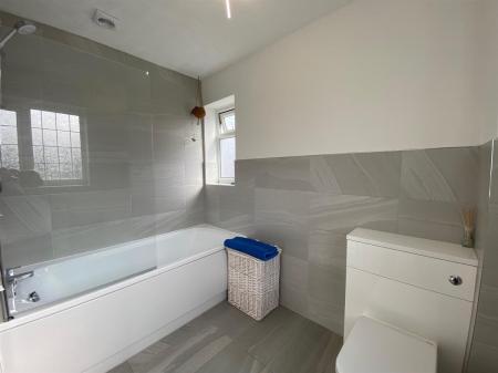 Dual aspect having uPvc double glazed, frosted window to the side elevation and uPvc double glazed, frosted window to the front elevation and fitted with a 3 piece suite comprising: vanity unit wash hand basin with mixer tap over and storage cupboards below, concealed cistern, low level W.C., panelled bath with mixer tap and housing an electric shower with glazed shower screen, single panelled radiator. Tiling to floor and walls.
