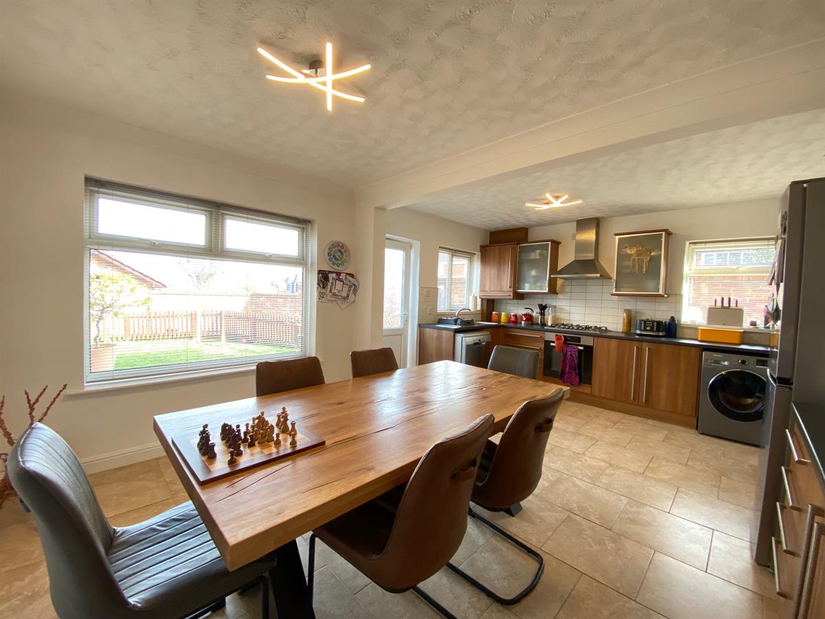 Spacious dining kitchen with 2 uPvc double glazed windows to rear elevation and a further double glazed window to the side elevation. uPvc double glazed panelled door leading to the rear garden. Tiled flooring throughout and fitted with a range of wall, base and drawer units having granite effect roll top worksurface over incorporating a stainless steel, single drainer sink unit with mixer tap and complimentary splash back tiling. Built in 5 ring gas burner hob with extractor over and electric oven below. Space for washing machine, space for dishwasher, space for fridge/freezer. Ample room for dining table and chairs. Double panelled radiator.
