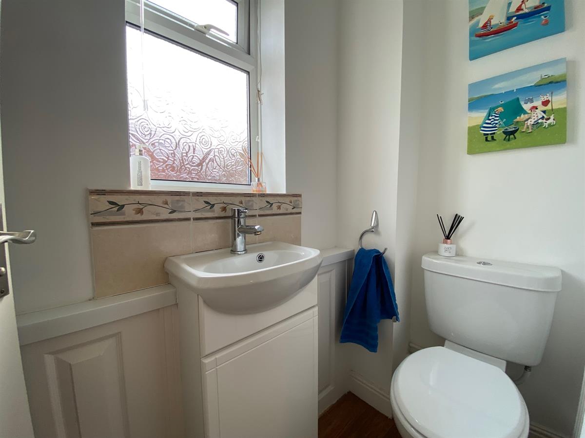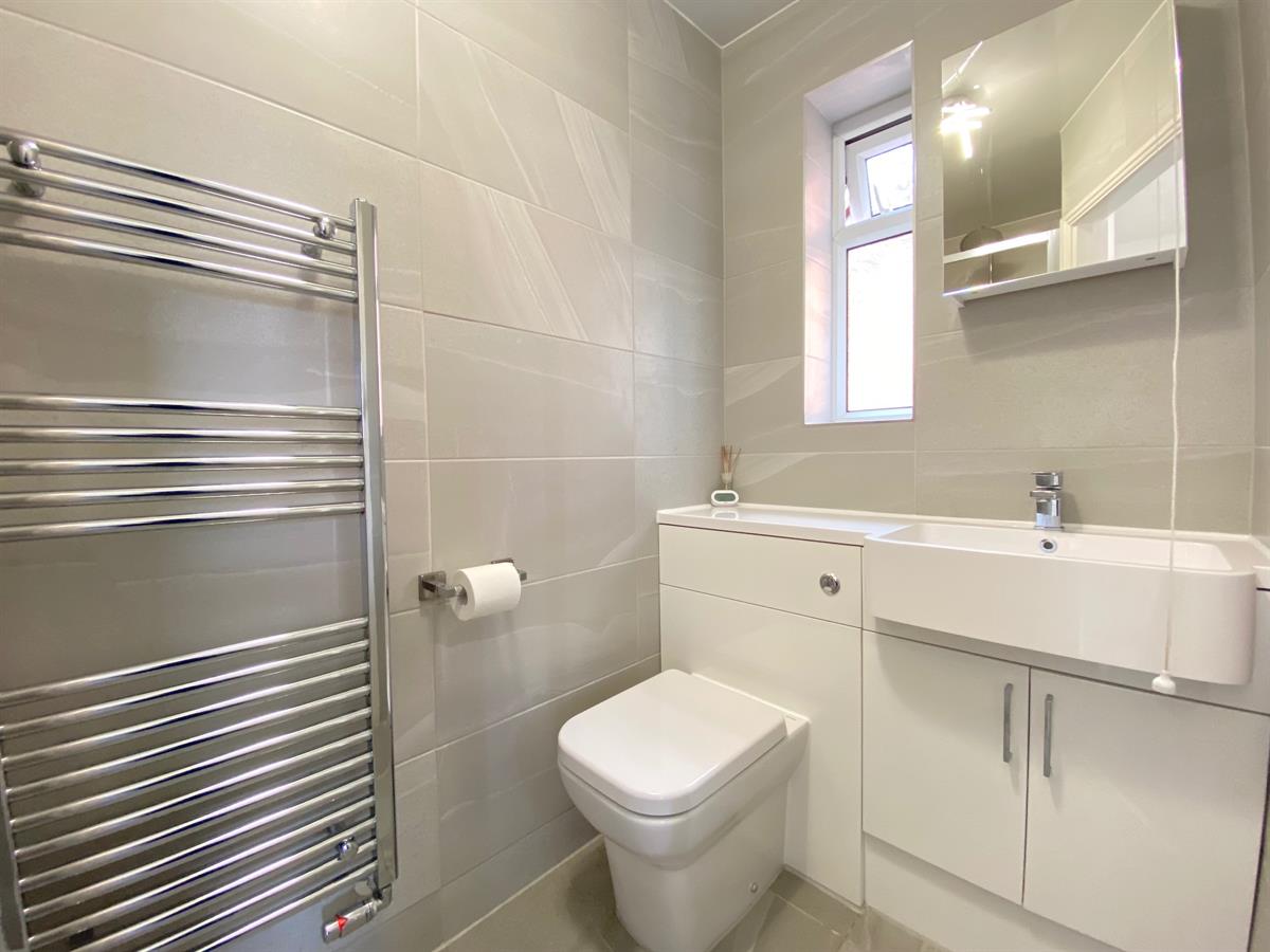 Fitted with a two piece suite comprising: Low level, push button W.C., vanity unit wash hand basin with mixer tap and complimentary tiling. Karndean flooring continued through from the Reception Hall. Single panelled radiator. uPvc frosted panelled window to side elevation.