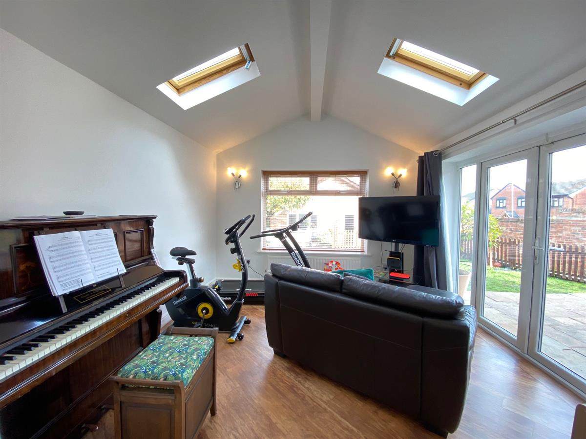 With Karndean flooring, double panelled radiator, uPvc double glazed window to rear elevation,'Velux' style ceiling windows and uPvc double glazed double doors opening onto the rear garden. Two wall light points.