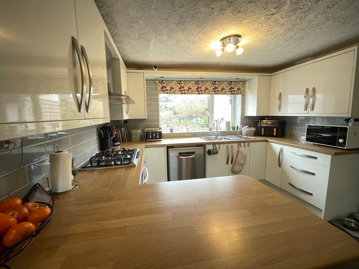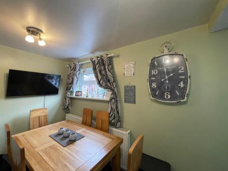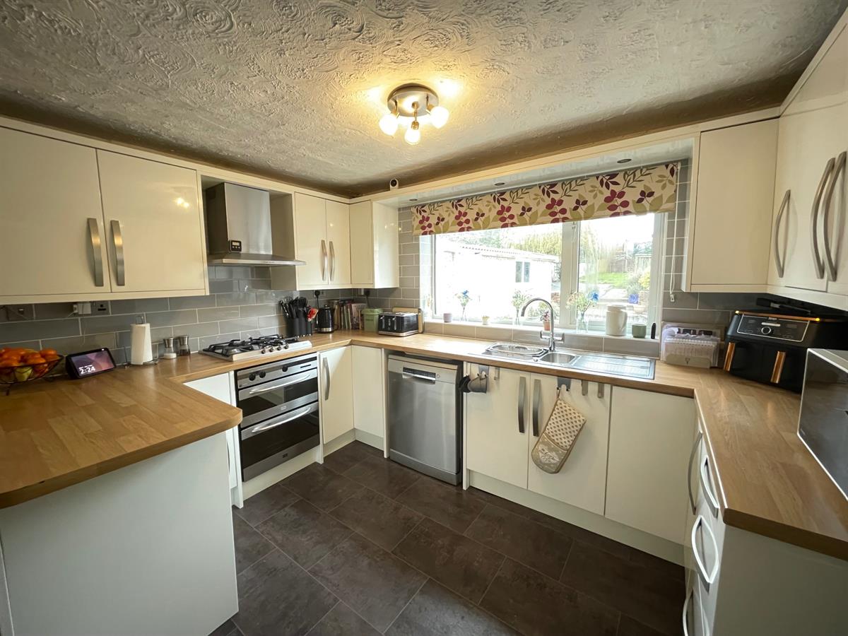 Fitted with a range of high gloss, white wall, base and drawer units with beech effect work surface over incorporating a one and a half bowl stainless steel sink and drainer with mixer tap, integrated electric oven with 4 ring gas burner hob and extractor over, complimentary tiling, space for fridge/freezer, space and plumbing for dishwasher uPvc double glazed window to rear elevation. Opening into dining area which provides ample room for dining table and chairs, and having uPvc double glazed window to side elevation. Radiator. Inner hall way has painted, panelled door into: