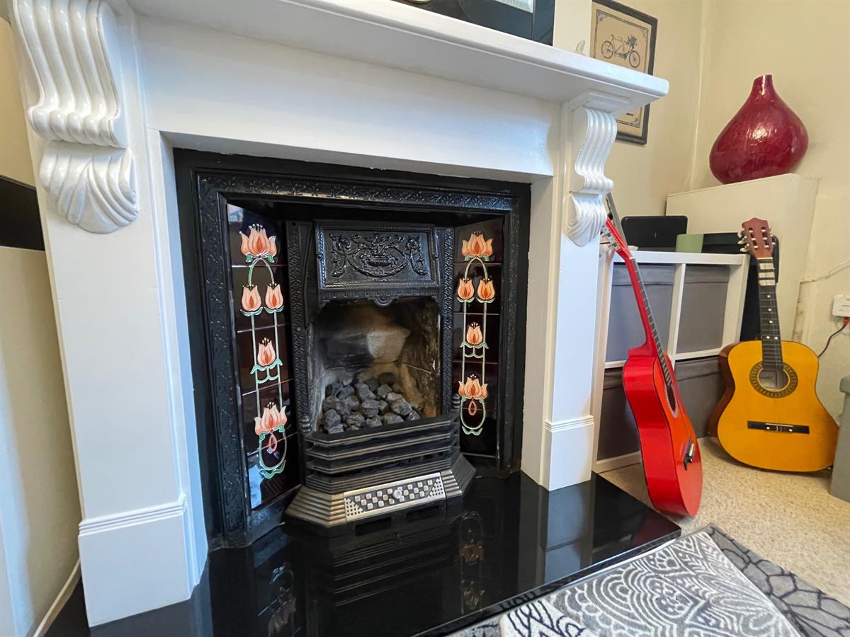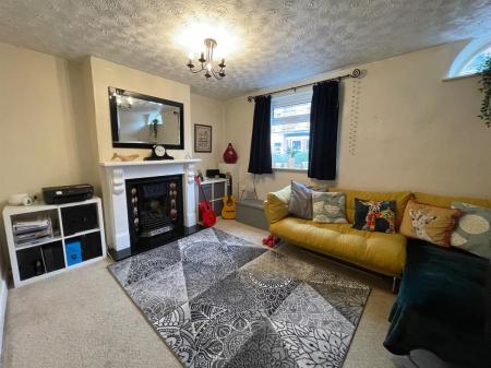 Generous reception room having feature fireplace with tiled slips and hearth and wooden surround, housing a coal effect fire, uPvc double glazed window to front elevation and single glazed arched window to front elevation. Radiator.