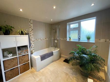Fitted with a 3 piece site comprising 'P' shaped panelled bath with mixer tap and shower over, having glazed curved pivot screen, low level push button W.C., pedestal wash hand basin with mixer tap, chrome ladder towel rail and fully tied walls and floor. Inset spotlighting and modesty glazed window to rear elevation.