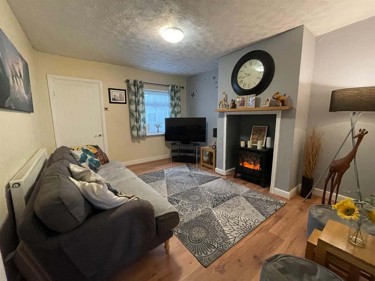 Large sitting room with feature fireplace having wooden mantle and housing an electric log effect burner, uPvc double glazed window to rear elevation, radiator door through to kitchen / diner and painted panelled door into: