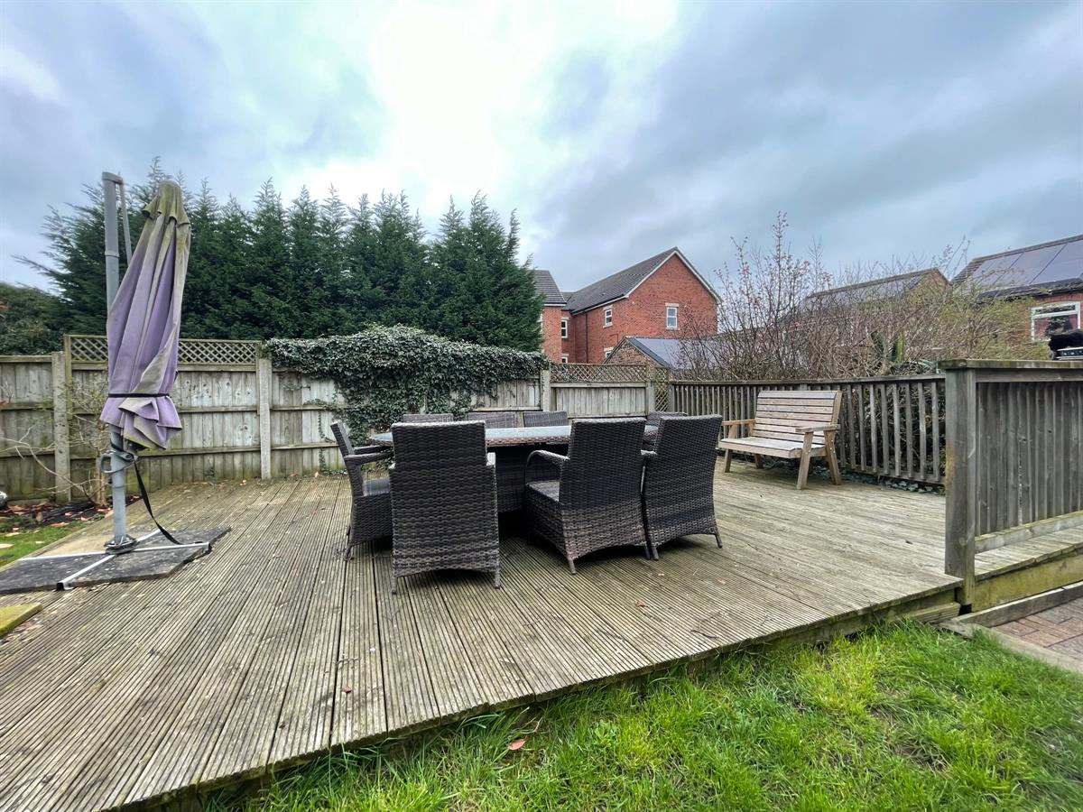 To the front of the property the block paved driveway extends to the front door and also along side to property to the double wooden gates which provide access to the rear garden. The boundaries are fenced and walled. The rear garden is fenced on all boundaries and is of generous proportions have a large lawned area, decking area which provides ample room for outside dining. From the rear of the property the block paved driveway extends to the rear of the property to form a patio area with raised beds housing a variety of mature shrubs and plants, specimen willow tree. Outside lighting and outside tap. A brick built storage shed along with a detached garage with up and over door and side access door adjoin the patio.