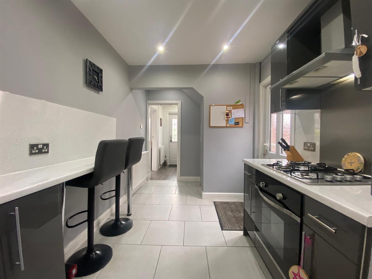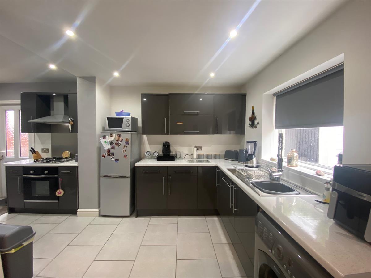To the kitchen area there is a uPvc double glazed panelled window to the rear elevation. The kitchen is fitted with a range of wall, base and drawer units with granite effect roll top work surfaces over incorporating a stainless steel single drainer sink unit with mixer tap, built in four ring gas hob with electric oven below and stainless steel splashback, inset spot lighting, space for fridge freezer, space for washer, built in breakfast bar tiled flooring throughout, wall mounted vertical radiator, uPvc double glazed frosted panelled door to the side of the property, built in storage cupboard housing the central heating boiler. To the family area there is space for table and chairs, tiled flooring, uPvc double glazed panelled doors leading out to the rear garden.