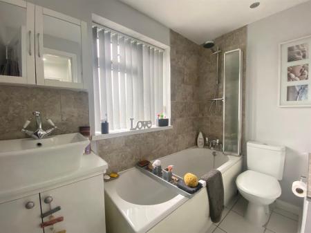 Having tiled flooring, uPvc double glazed panelled frosted window to the front elevation, inset sensor activated spot lighting, heated towel rail finished in chrome. Three piece suite comprising of a push button low level WC, vanity unit wash hand basin with mixer tap, storage cupboard below and complimentary splash back tiling, panelled bath with glazed bi-folding shower screen over housing a mixer tap and mixer shower, complimentary wall tiling.