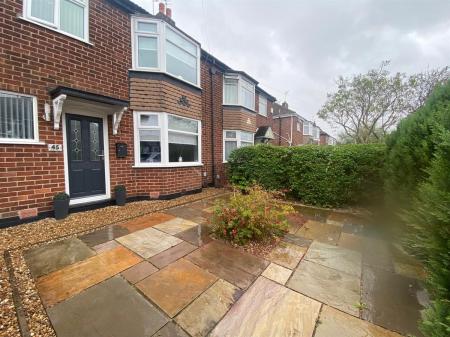 To the front of the property there are walled and fenced boundaries with gravel borders housing a variety of trees and shrubs, the garden area is laid to Indian stone with a paved driveway providing off road parking and covered porch with outside lighting, decorative wrought iron access gate giving access to the side of the property leading to the garage.