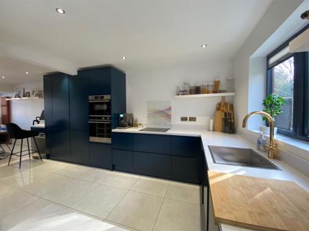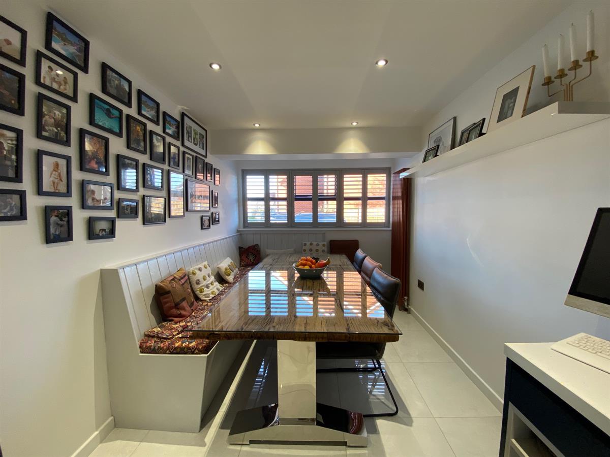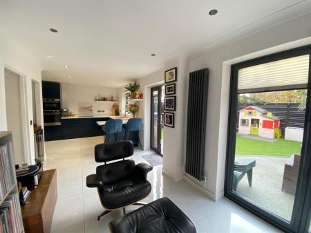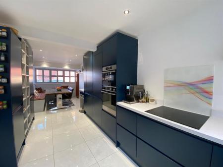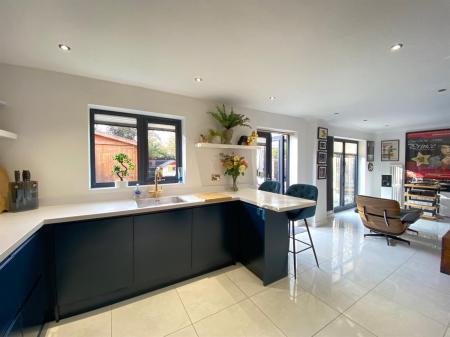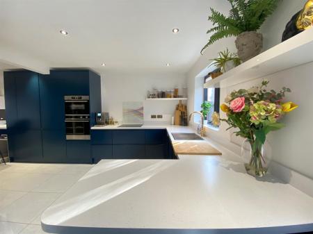 To the kitchen area the space is fitted with a range of soft close, wall, base and drawer units with quartz effect worksurfaces over incorporating a stainless steel sink unit with mixer tap, integrated washer/dryer, integrated dishwasher, integrated fridge, integrated freezer, integrated electric oven and microwave/combination oven, four ring induction hob, inset spotlighting, polished tiled flooring continued through from the reception hall. Built in breakfast bar. uPvc double glazed windows to front elevation again having Plantation shutters. Vintage style wall mounted radiator. uPvc double glazed windows to rear elevation, uPvc French doors to rear elevation and uPvc double glazed Bi-fold doors to rear elevation. Built in wine fridge with additional shelving over. Ample room for dining table and chairs and having fitted banquet seating.