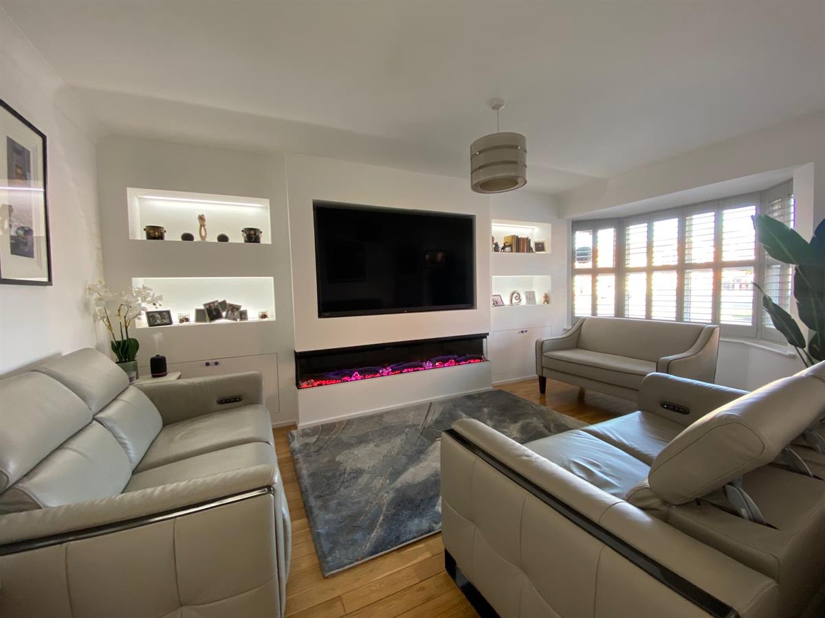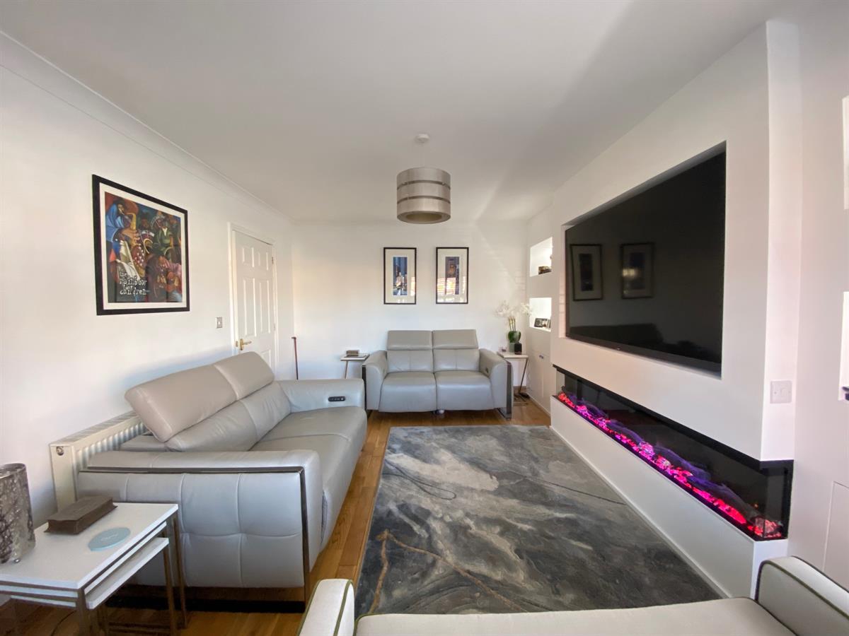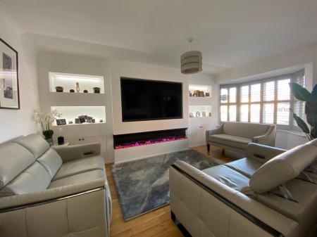 Superb, spacious sitting room with media wall with contemporary multi flame, log effect, remote control fire, shelving with concealed lighting, uPvc double glazed, walk in bay window to the front elevation having Plantation shutters, oak flooring, double panelled radiator.