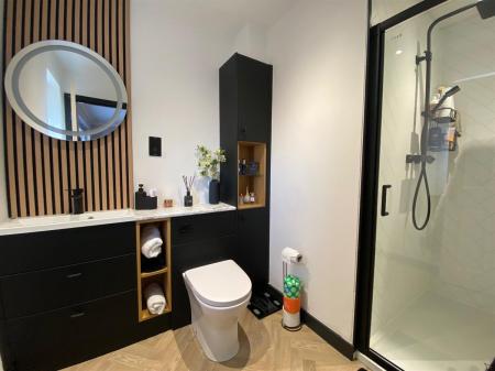 Fitted with a 4 piece suite comprising low level W.C., pedestal wash hand basin with mixer tap and complimentary splashback tiling, panelled bath with mixer tap and hand held shower over, walk in shower cubicle with glazed pivot door and housing a mixer shower.uPvc modesty glazed window to rear elevation, complimentary tiling, Radiator. Inset spotlighting.