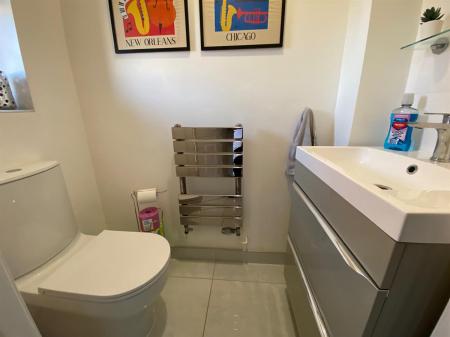 Fitted with a 2 piece suite comprising: Low level, push button W.C., vanity unit wash hand basin with mixer tap over and storage drawers below, uPvc modeaty glazed window to front elevation. Chrome ladder style heated towel rail. Polished tile flooring continued through from the reception hall.