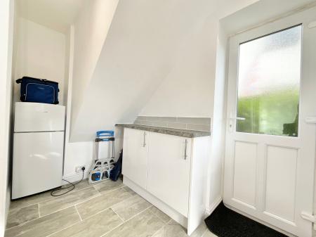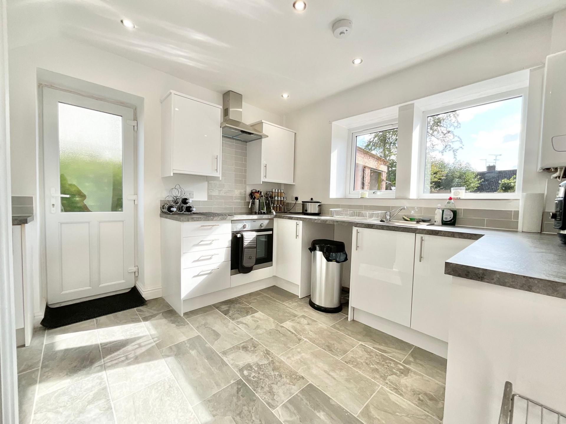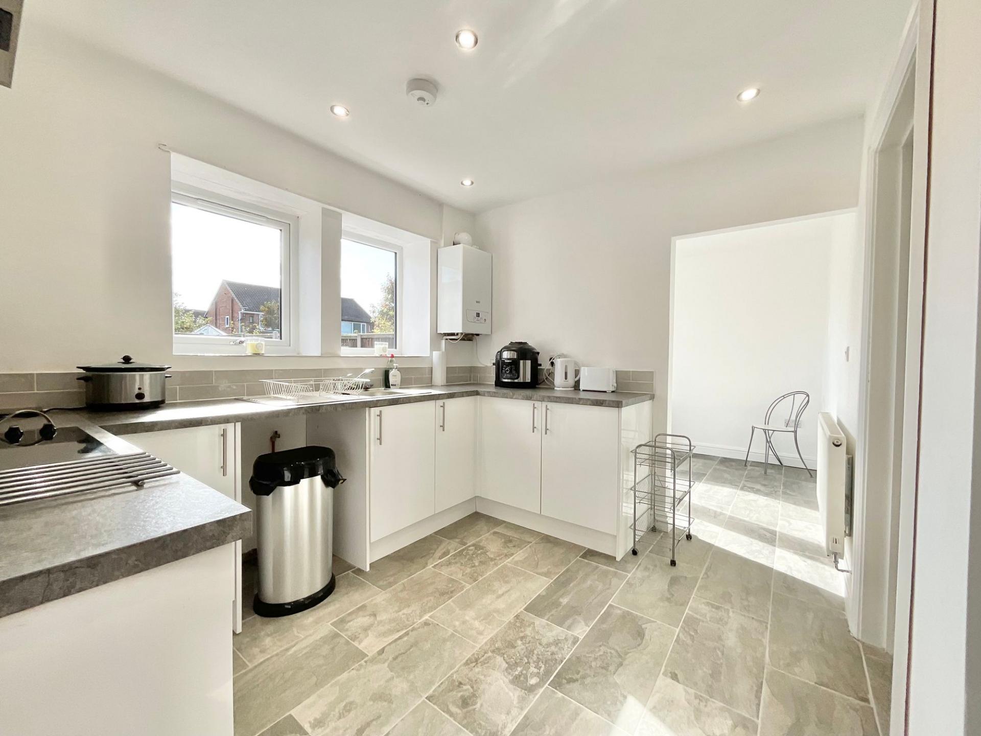 - Modern fitted kitchen with electric hob, oven, extractor, and utility area with plumbing for washing machine
