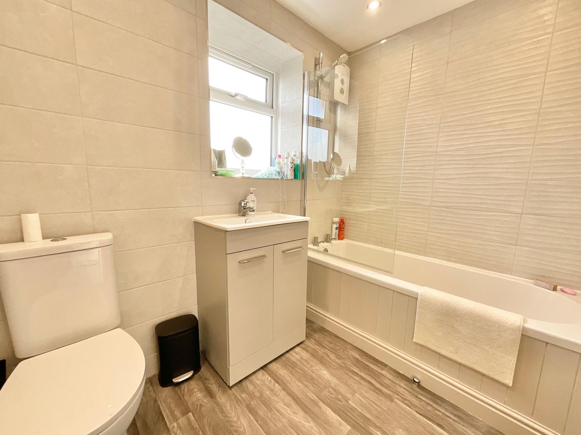- Stylish bathroom with bath, electric shower, WC, and vanity unit