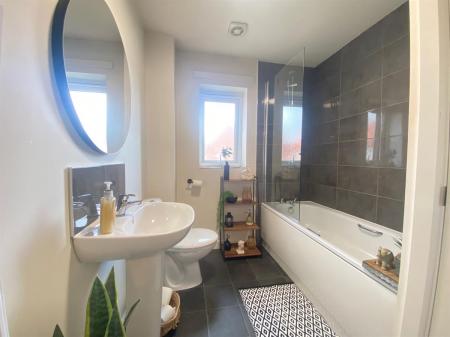 Family bathroom with a three piece suite comprising of a pedestal wash hand basin with mixer tap and complimentary splash back tiling, push button low level WC, panelled bath with mixer tap and mixer shower over, complimentary wall tiling, built in storage cupboard, uPvc double glazed frosted panelled window to the rear elevation, single radiator.