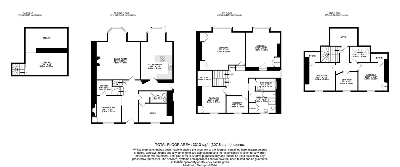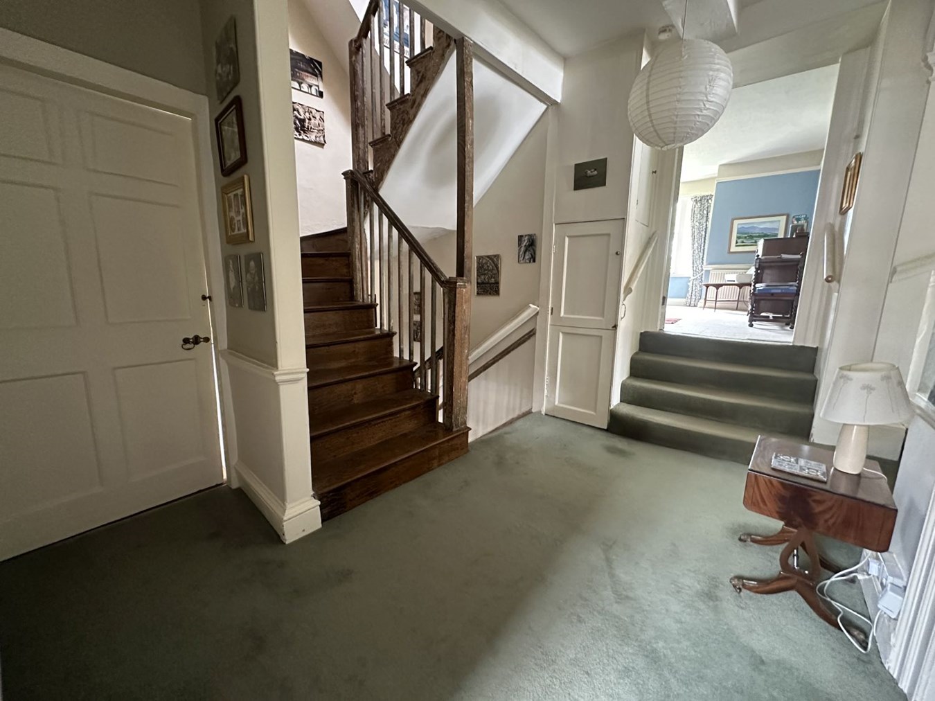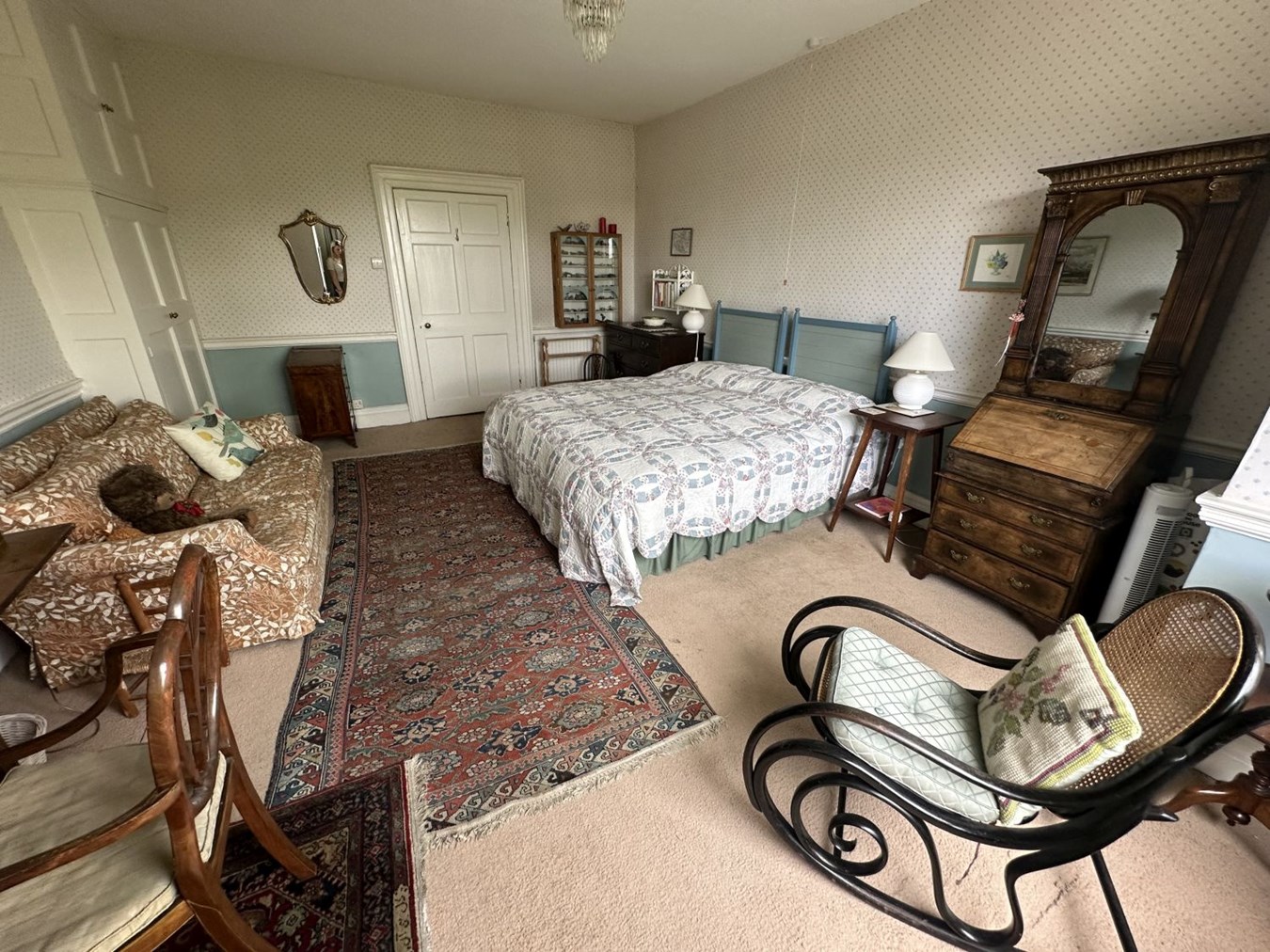 A beautiful, original wooden staircase leads to the first floor, where you will find four bedrooms. The rear two bedrooms are spacious, featuring built-in wardrobes and large sash windows with views of the Pen Cerrig Calch and Mynydd Llangatwg. This floor also has two bathrooms, one of which includes a bath and- separate shower. The fourth bedroom is currently used as a sitting room and features a glazed fanlight with barley twist glazing bars above the door, part of the Grade II* listing. The second floor offers three additional bedrooms, a store room and access to the attic. The property is rich with period features, including exposed beams, cornices, panelled doors, cast iron fireplaces and sash windows. There is also a good-sized cellar providing ample storage space.