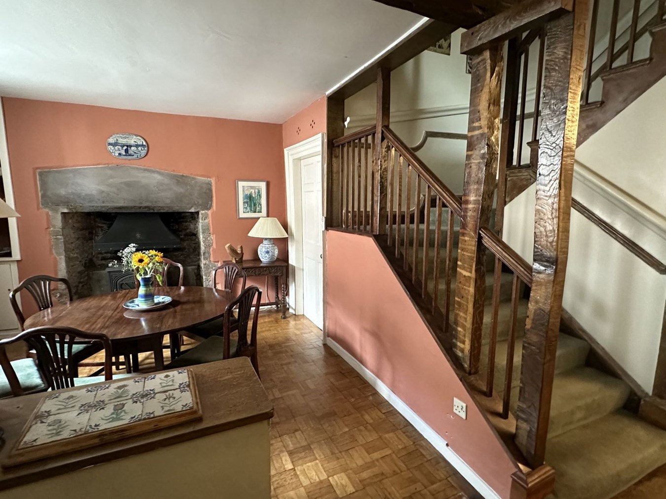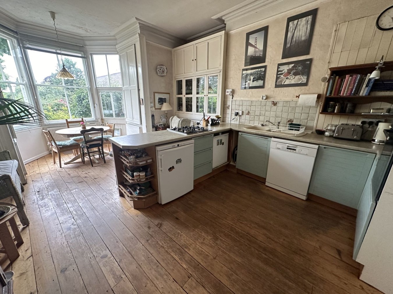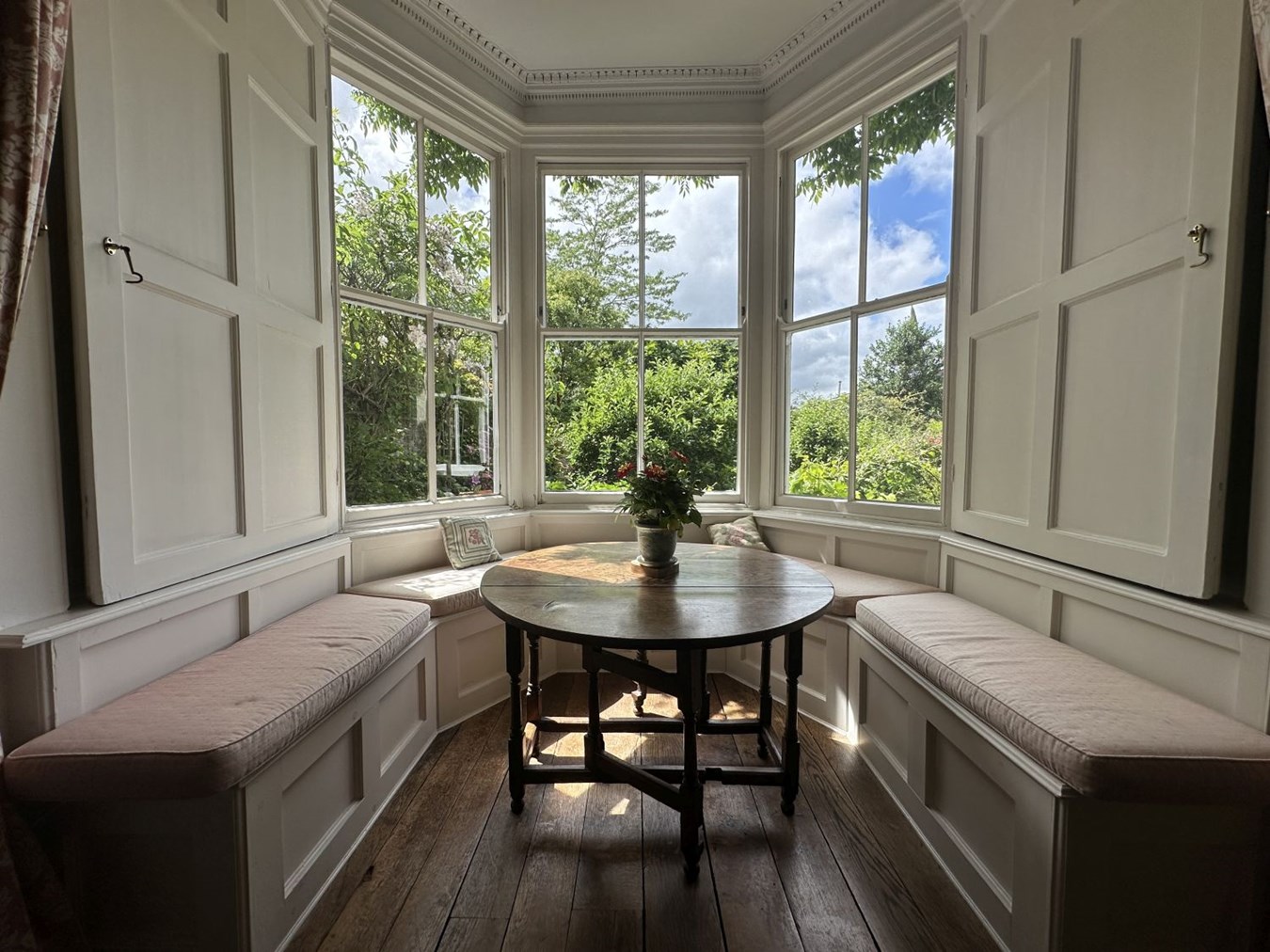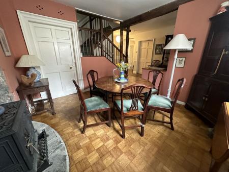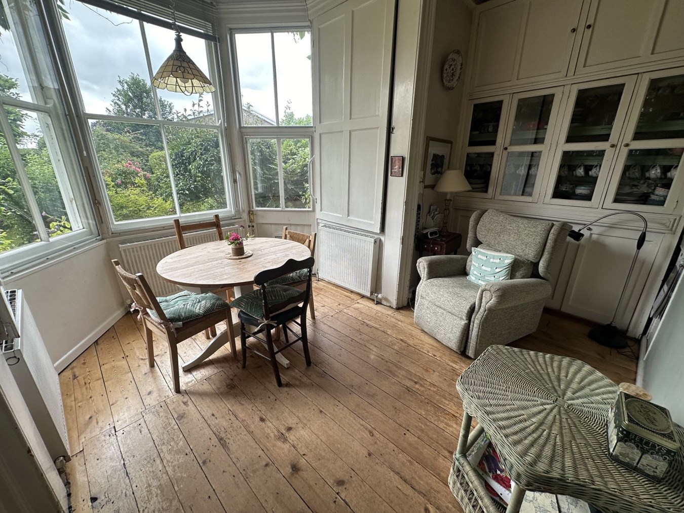 Upon entering the property, you are greeted by an entrance hall with original wood flooring that extends into the living room. The dining room, open to the entrance hall, features an inglenook fireplace with a wood-burning stove and a useful pantry off. To the right of the entrance hall is a convenient cloakroom with plumbing for a washing machine and a store room, which could be repurposed as an office. At the rear of the property, a large living room provides the perfect space for family gatherings. This bright room is adorned with coving, a delightful bay window with window seats and original wooden shutters. Completing the ground floor is the kitchen/diner, which also boasts a bay window with a door leading to the rear terrace. The kitchen is equipped with base cupboards, a built-in dresser, an integrated oven and hob and plumbing for a dishwasher.