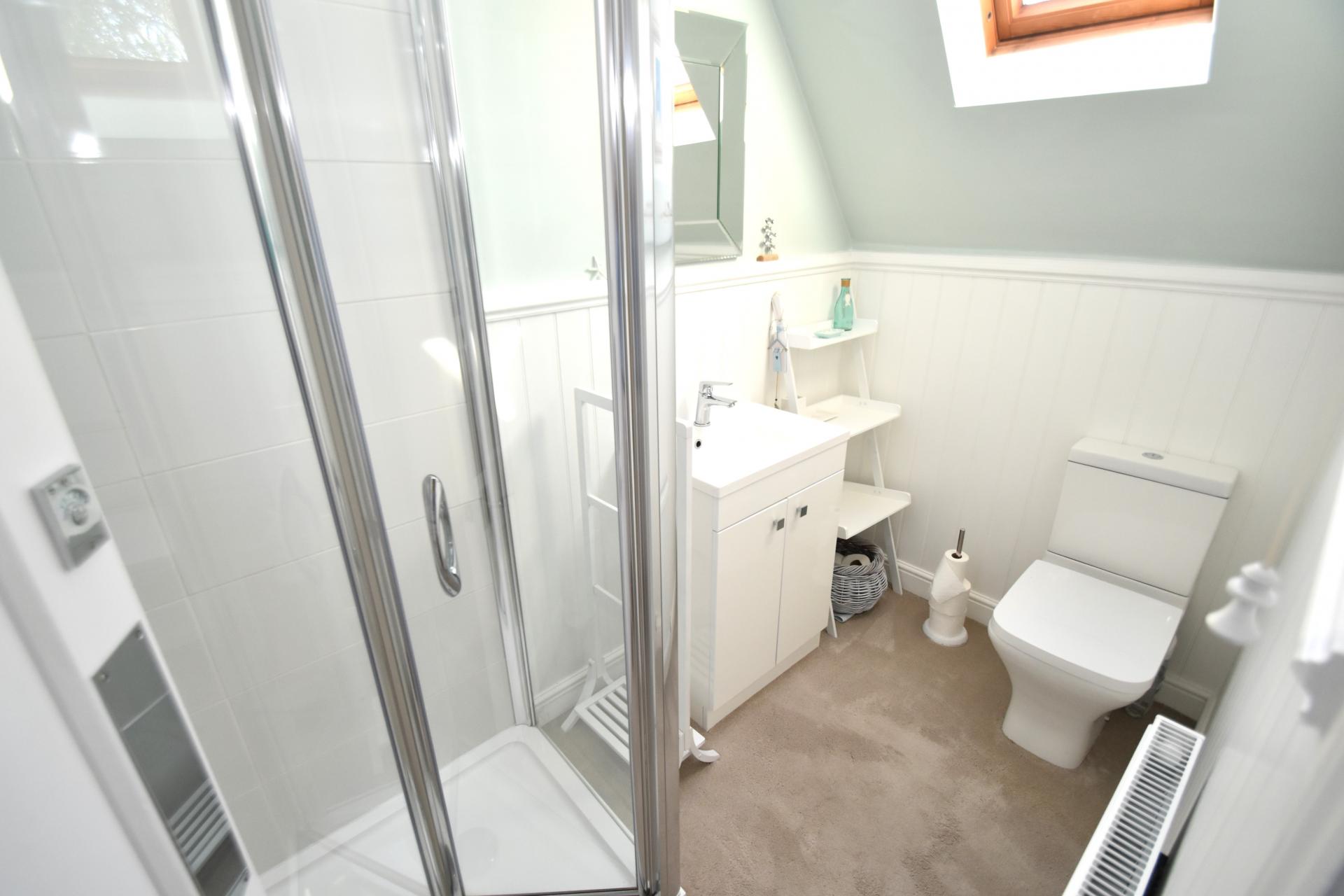 Shower Room 8' 4" x 4' 5" (2.54m x 1.35m) With white contemporary suite comprising of double shower cubicle with rainwater shower and handheld shower, vanity hand basin with mixer tap, pop-up waste and cupboard under, low level WC, radiator, attractive part panelled walls with dado rail, carpet, Velux window.
