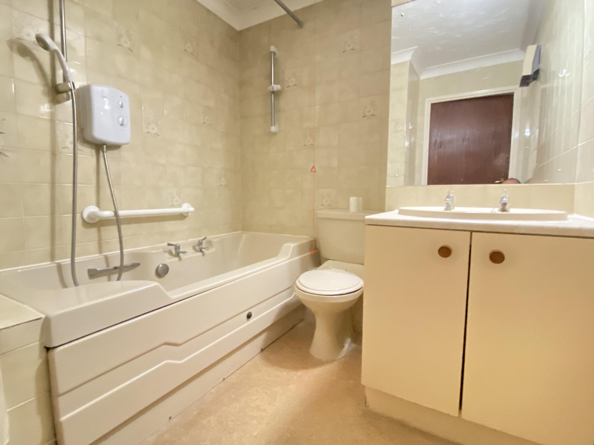 Bathroom 6' 9" x 6' 9" (2.06m x 2.06m) extending to 8'9" Ivory 3 piece suite comprising accessible bath with tiled surround and electric shower over, low level w.c. and vanity basi with cupboard beneath, extractor fan, electric fan heather, shaver/light unit.