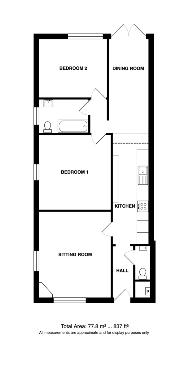 The accommodation comprises an entrance hall with cloakroom off, light and airy sitting room, modern fitted kitchen including integrated appliances which opens up to the dining room, two good sized double bedrooms and a modern bathroom. Benefits include uPVC double glazing and gas fired central heating.