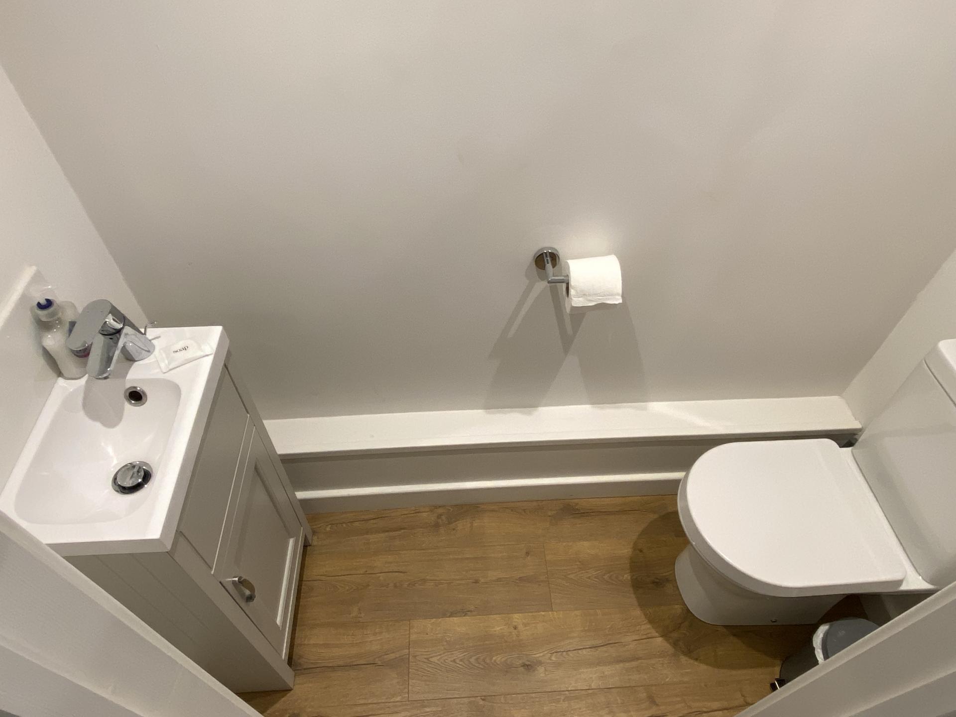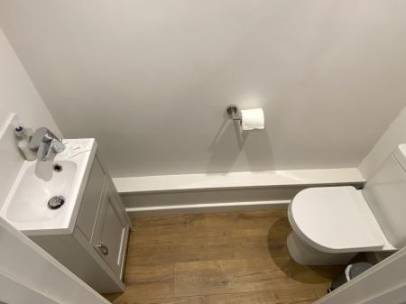 Cloakroom Fitted with a low level WC, hand basin with mixer tap and unit beneath, wall mounted heated towel rail, recessed spotlights, extractor fan, laminate flooring.