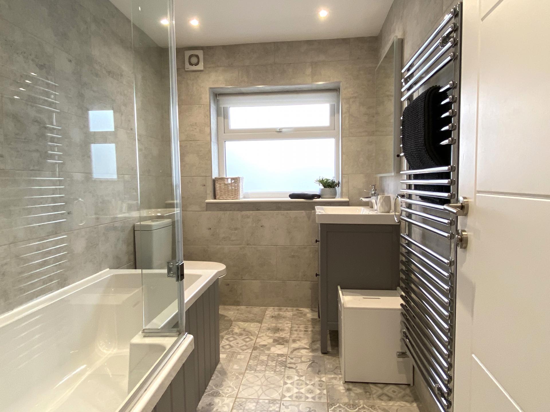 Bathroom 8' 5" x 5' 9" (2.57m x 1.75m) Fitted with a P-shaped bath including shower screen and mixer shower over, vanity basin with mixer tap and unit beneath, low level WC, tiled floor, fully tiled walls, heated towel rail, recessed LED spotlights, extractor fan, side aspect UPVC double glazed window.