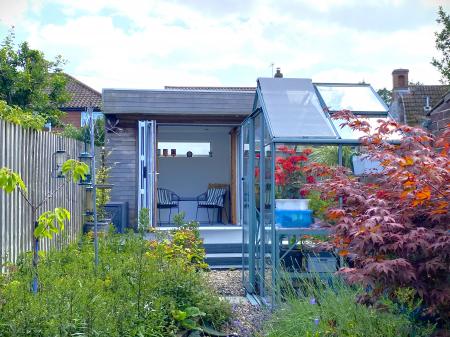 The pretty bisected rear garden extends to some 53' with paved patio area adjacent to the property from which a lawned winding path leads through beds of flowers and shrubs to a raised composite deck which gives access to an excellent modern garden studio 9'5" x 8'3" with plaster finish walls light and power, bi-fold double glazed doors onto the timber deck, making this an ideal recreation or relaxation space outside the main house. Greenhouse. Pedestrian access gate to the rear.