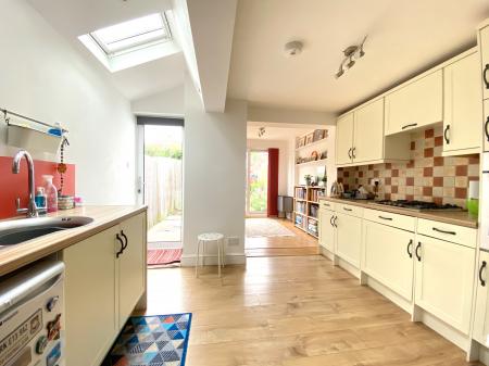 The home has been thoughtfully extended and now offers a stunning 27' open-plan kitchen, dining, and living space with skylights and patio doors leading to the rear garden-perfect for entertaining or relaxing. At the front, a cosy sitting room with an open fireplace offers a quiet spot to unwind.