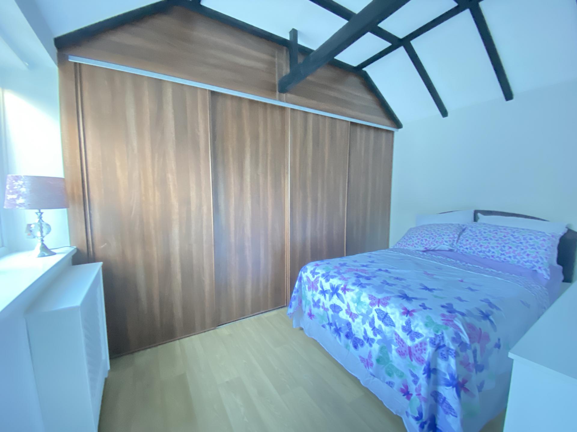 Bedroom 1 12' x 9' 4" (3.66m x 2.84m) including fitted wardrobes with hanging rail and shelves Vaulted ceiling with exposed timbers, radiator, with fitted screen.