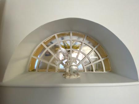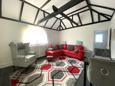 Sitting/Dining Room 16' 1" x 12' (4.9m x 3.66m) Vaulted ceiling with ceiling with exposed beams, radiator, arched feature internal window from the original building, uPVC sealed unit double glazed window, mock fire place, ceramic tiled floor.
