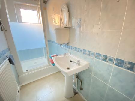 Shower Room 8' 2" x 3' 6" (2.49m x 1.07m) White 2 piece suite comprising shower cubicle and pedestal wash basin, ceramic tiled wall, uPVC sealed unit double glazed window,