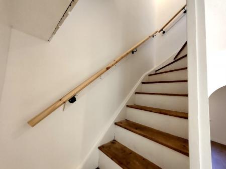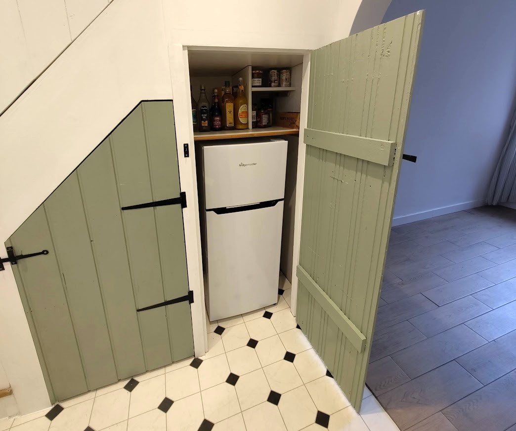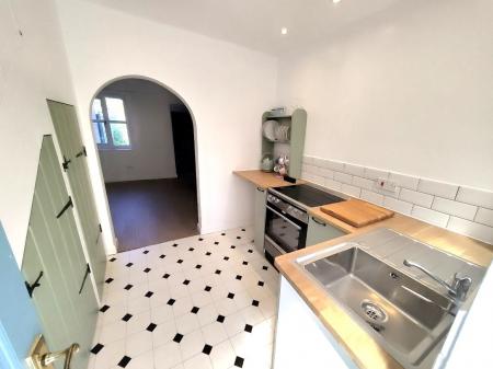 Kitchen 10' 1" x 7' 9" (3.07m x 2.36m) Stainless steel single drainer sink unit inset to solid oak worktops, electric cooker point, plumbing for automatic washing machine, fitted base units and matching chantry green built-in storage cupboards beneath the stairs with fridge freezer, cushion vinyl flooring, turning stairs leading to the first floor.