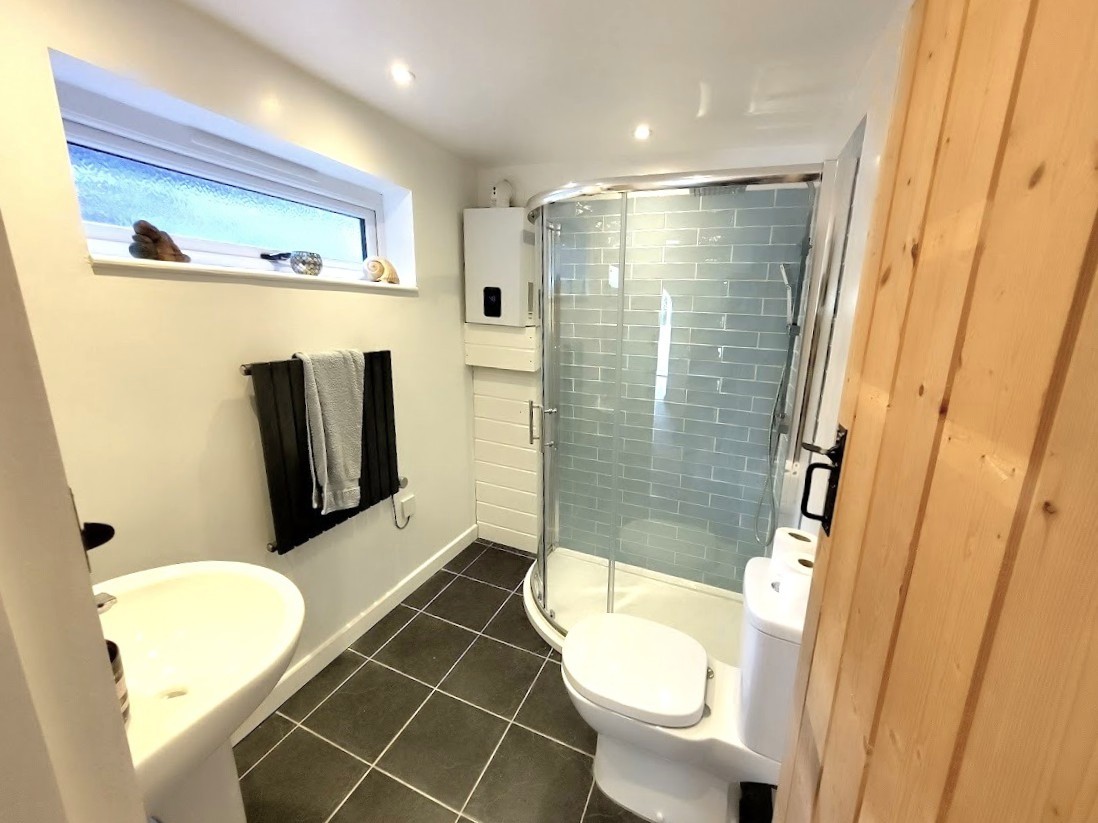 Shower Room 7' 1" x 5' 5" (2.16m x 1.65m) White 3 piece suite comprising quadrant corner shower cubicle with curved screen, low level wc and pedestal wash basin, tiled splashbacks, ceramic tiled floor, designer style electric radiator, wall mounted gas fired water heater, uPVC sealed unit double glazed window, inset ceiling lights, extractor fan.