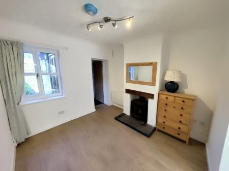 Sitting Room 10' x 10' 1" (3.05m x 3.07m) into alcoves Woodburning stove with tiled hearth, wood effect tiled floor, coved ceiling, electric radiator, uPVC sealed unit double glazed window, stripped pine door to:
