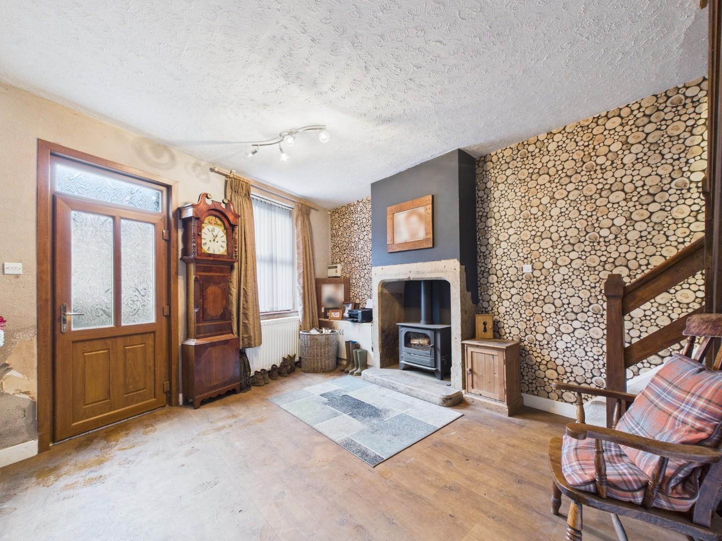 Reception Room - 5.03 x 3.97 (16'6" x 13'0") - A spacious and adaptable reception room featuring a large stone fireplace with a log-burning stove set upon a substantial stone hearth, providing both charm and a welcoming focal point. With uPVC front aspect window and oak-effect vinyl flooring. This versatile room is well-suited for use as a formal reception area, a private study, or a generous entrance lobby, making it a flexible addition to the property