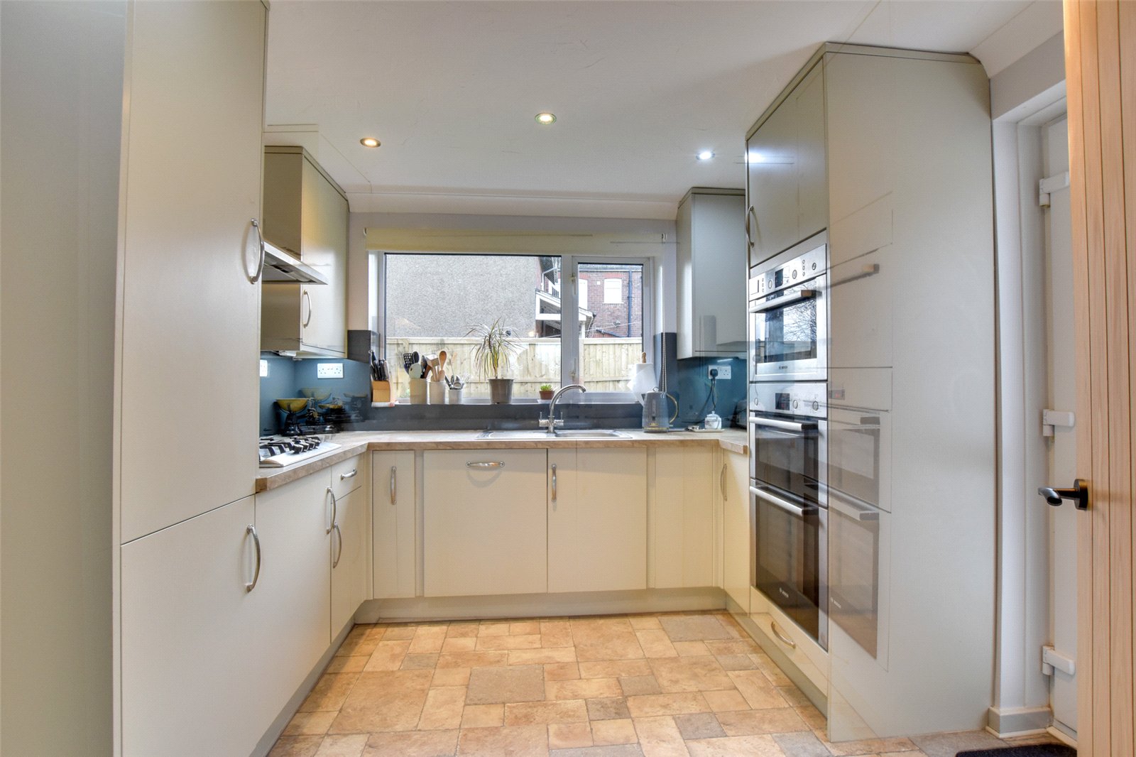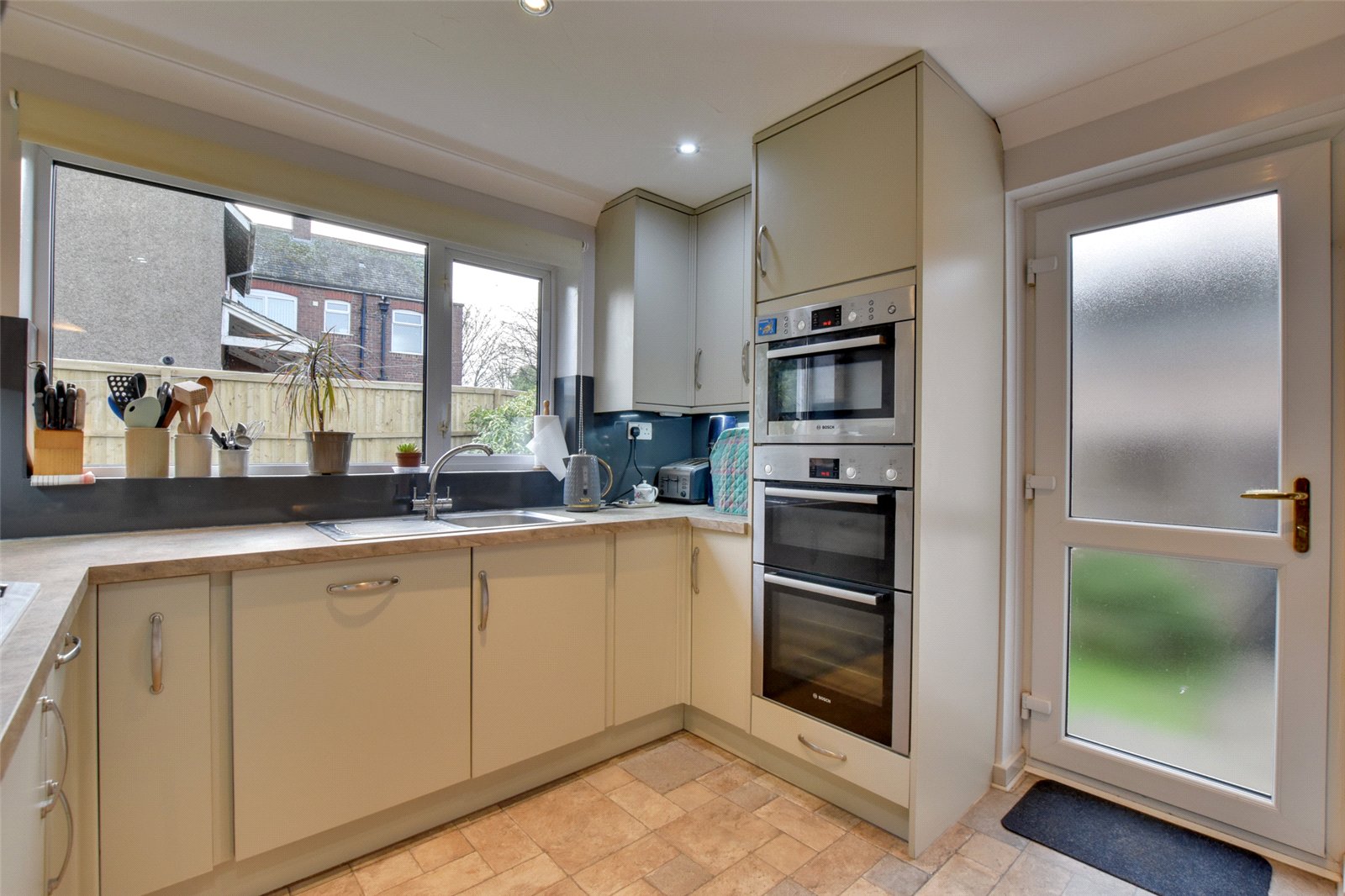 The kitchen boasts a rear view aspect overlooking the garden, with a side door which leads outside. There is also a storage cupboard, which has plumbing to convert to a WC if required.