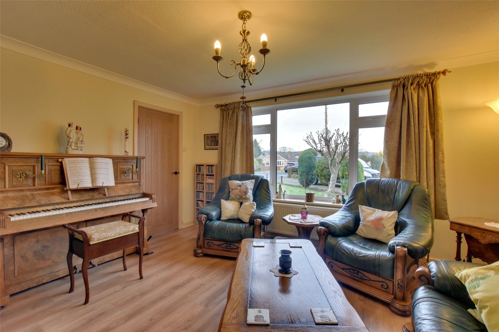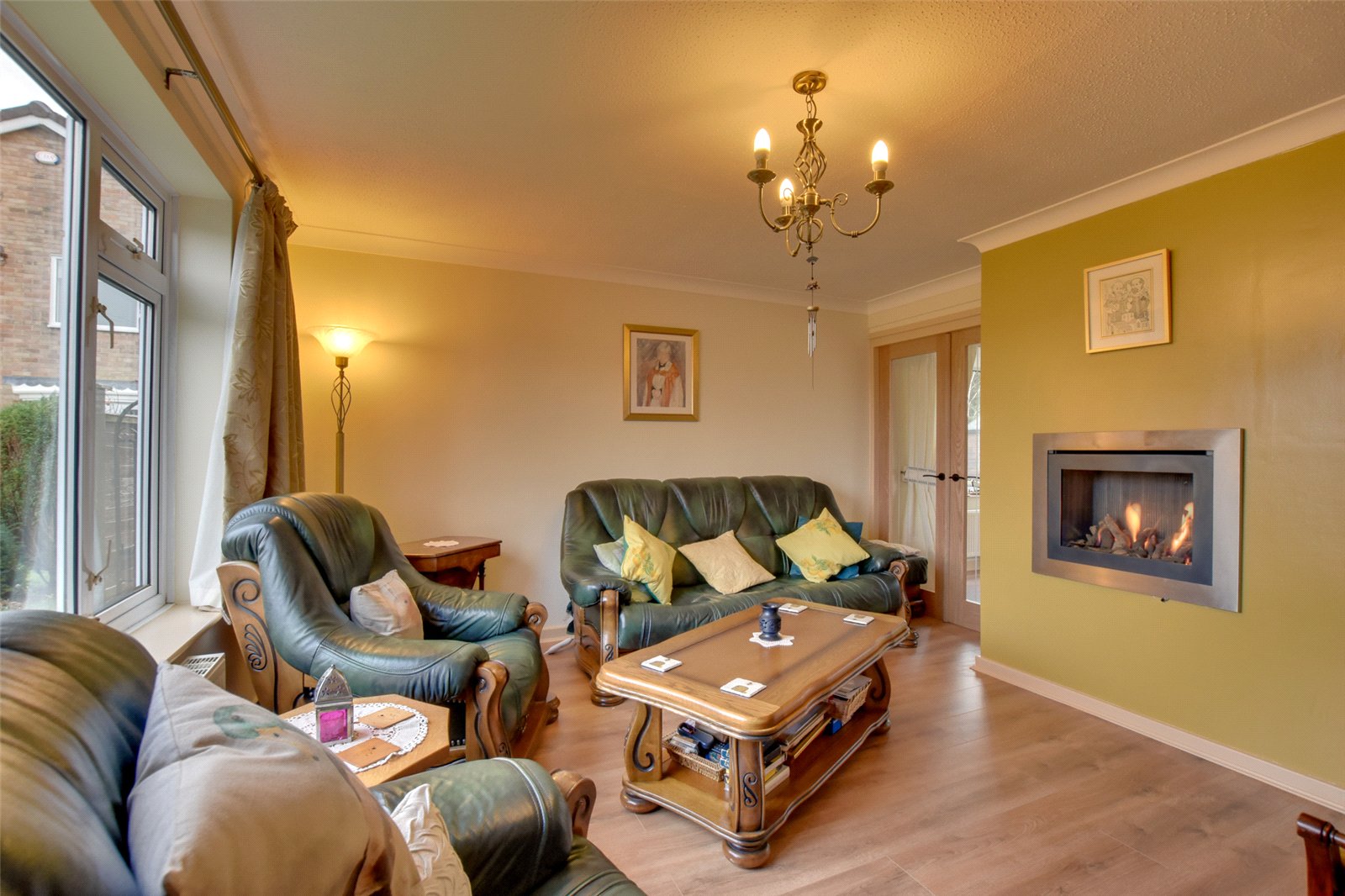 To the left hand side lies the living room, where the laminate floor continues from the hallway. Enjoying a front facing aspect which overlooks the pleasant garden, the focal point of the room is the living flame gas fire, which is recessed into the chimney breast.