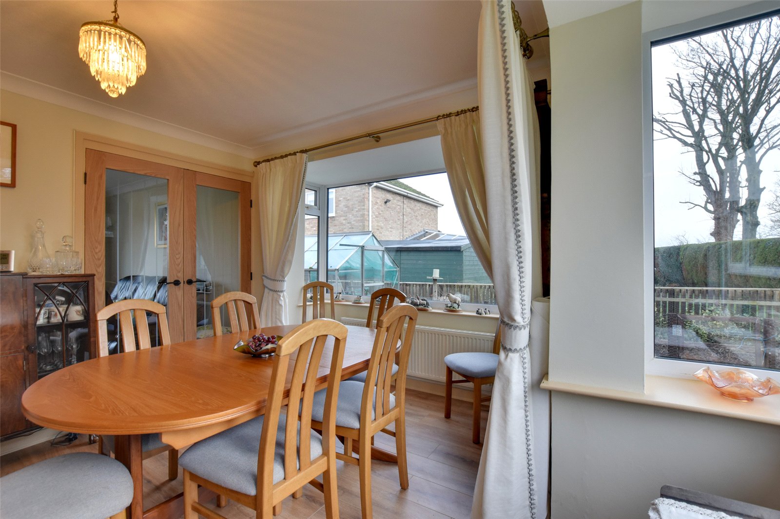From here, partially glazed double, wooden doors lead into the dining room. The dining room enjoys a rear and side view aspect with walk in bay windows, which allows the room to be filled with natural light. Overlooking the properties spacious rear garden, the dining room offers ample space for a dining table and other freestanding furniture.