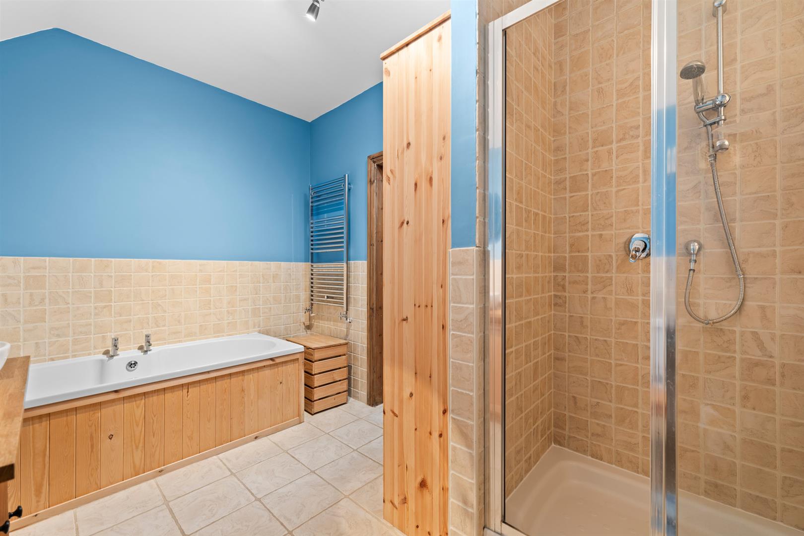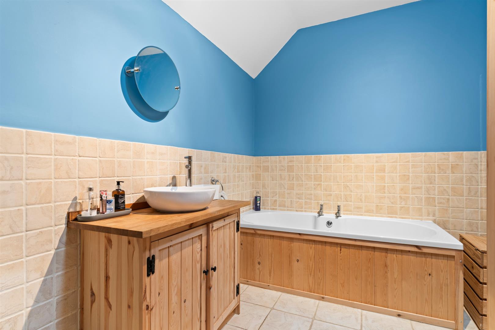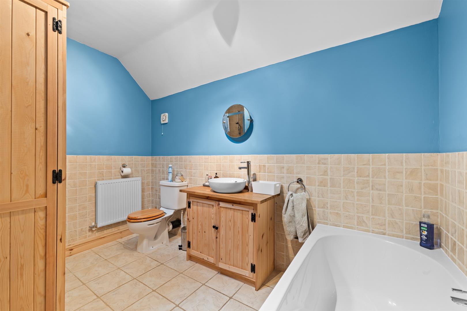 Bath/Shower Room - 3.40m x 2.31m (11'2" x 7'7") - A well proportioned space fitted with a four piece suite comprising panelled double ended bath with chrome taps and tiled splash backs, separate shower enclosure with sliding screen and wall mounted shower mixer, close coupled WC and vanity unit with pine door fronts, oak vanity surface over and round bowl washbasin with chrome mixer tap; tiled splash backs and floor, contemporary towel radiator, part pitched ceiling and inset light tunnel.