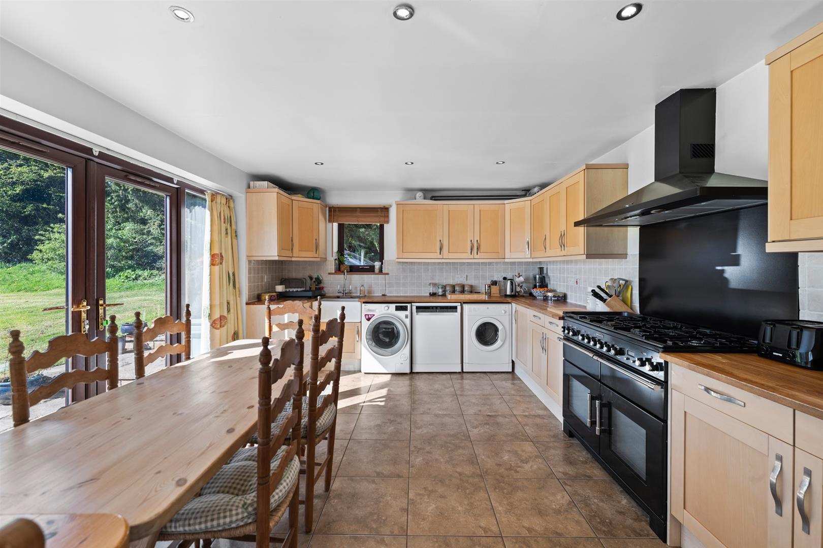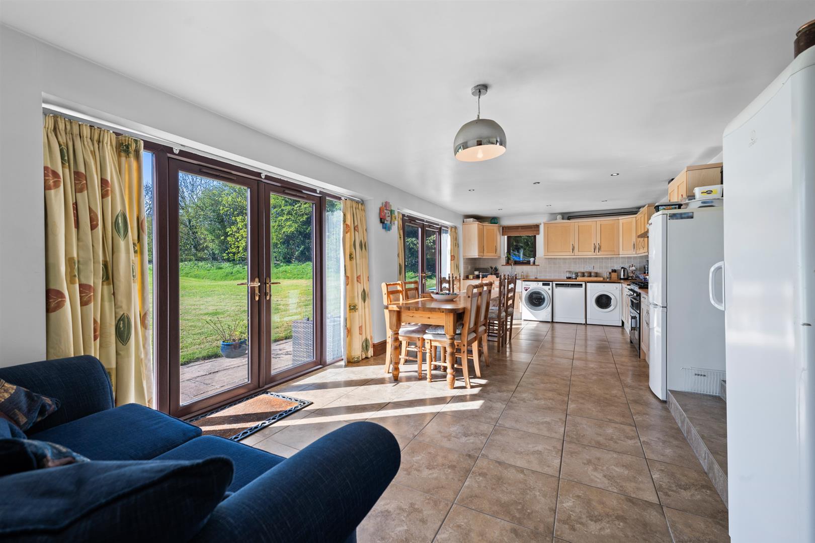 Dining Kitchen - 8.79m x 3.61m (28'10" x 11'10") - A well proportioned, light and airy, open plan space flooded with light benefitting from windows to two elevations as well as two pairs of double glazed French doors with a southerly aspect into the rear garden. The room is of generous proportions and is large enough to accommodate both a living and dining area. This is in turn open plan to a kitchen which is fitted with a generous range of wall, base an drawer units providing an excellent level of storage, having a U shaped configuration of butchers block preparation surfaces with undermounted ceramic sink with chrome swan neck mixer and tiled splash backs; space for free standing range, plumbing for washing machine and dishwasher, space for tumble dryer, wall mounted gas central heating concealed behind kitchen cupboard, tiled floor and inset downlighters to the ceiling.