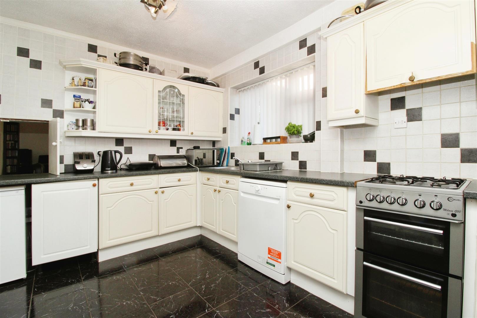 Kitchen - Double glazed windows, range of wall & base units, stainless steel sink with drainer, tiled floor and tiled splash back.