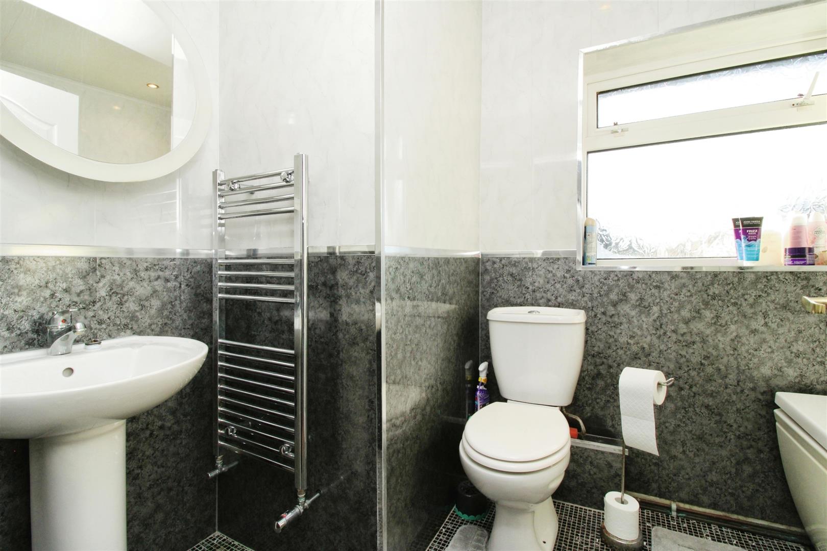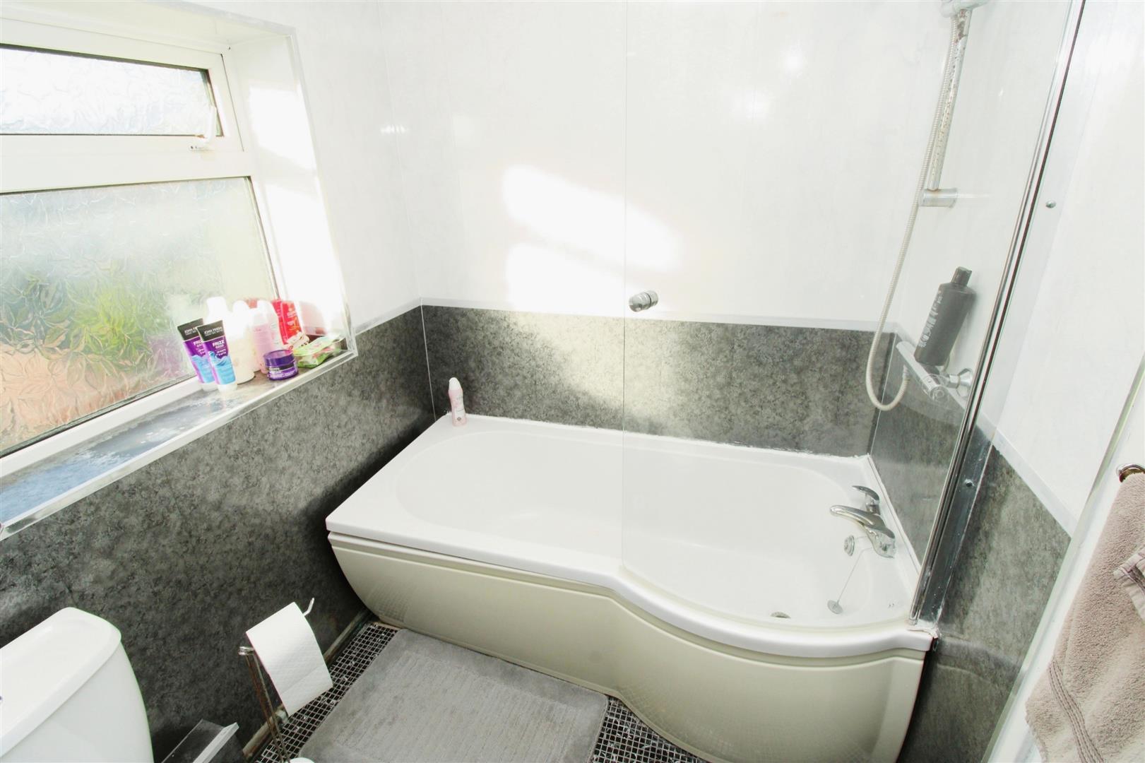 Bathroom - WC, basin, double glazed window, tiled floor & bath with shower.