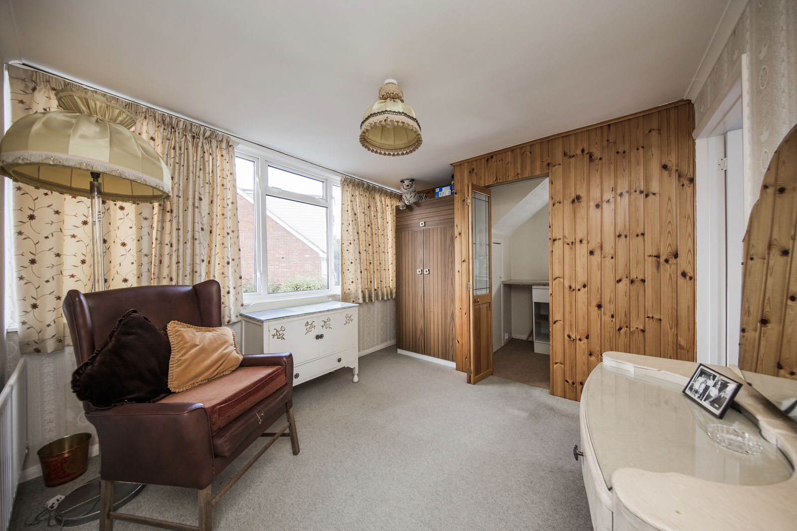 BEDROOM: A dual aspect bedroom with a large walk-in cupboard with hanging rail, fitted wardrobe with hanging rail, fitted carpet, radiator and windows to front and rear with fabulous far reaching views to the side.