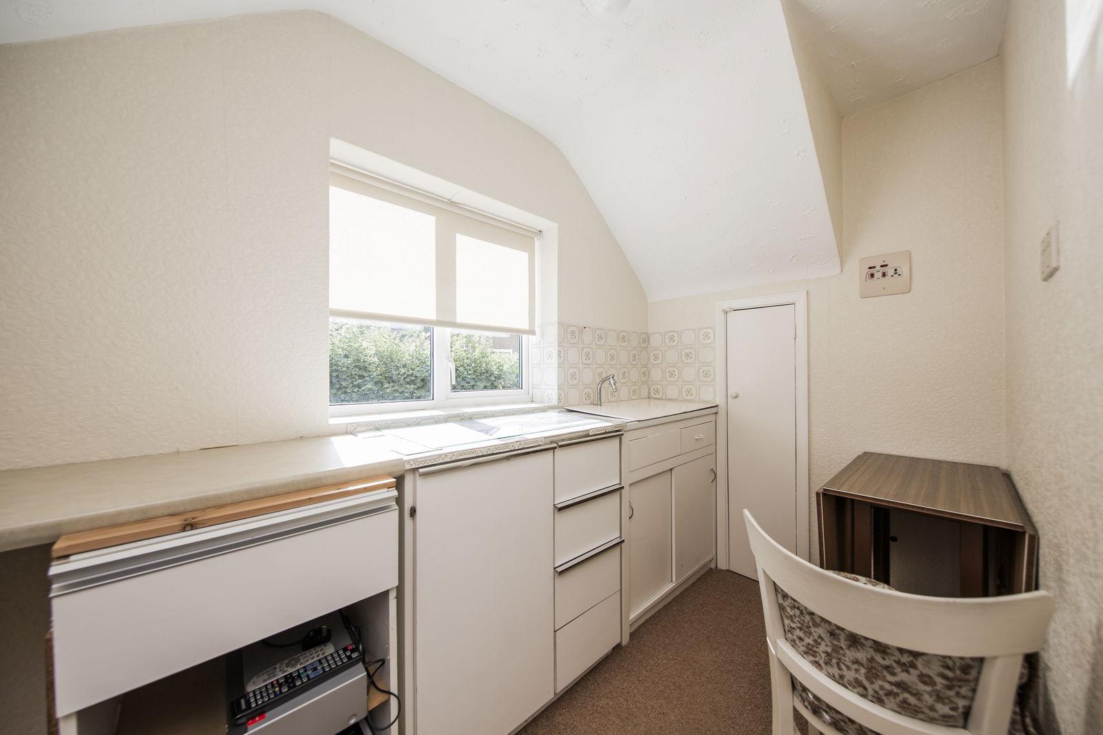 UTILITY ROOM: Low level units incorporating a sink with mixer tap, two eaves cupboards with shelving and window to side with fitted blind.