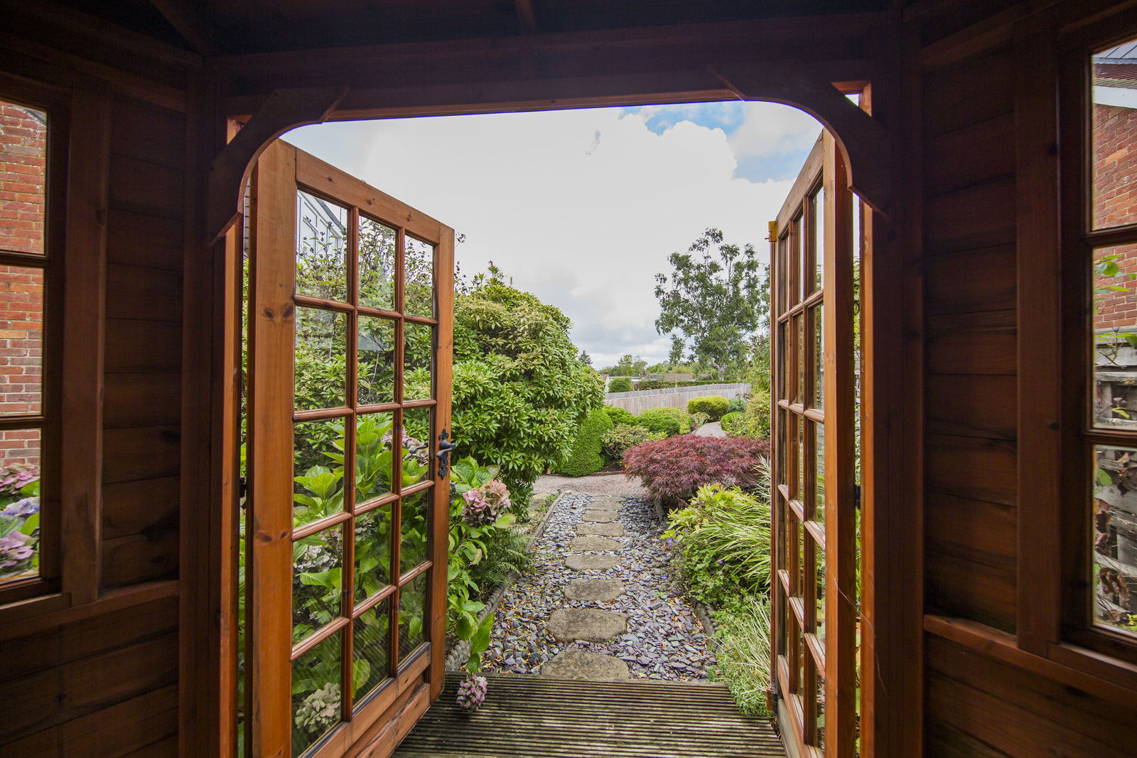 OUTSIDE REAR: Private rear garden is mainly laid to lawn with a selection of flower bed borders, mature trees, patio area and a wooden shed.