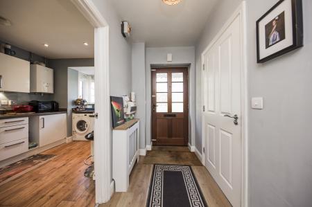 ENTRANCE HALL: Wood effect laminate flooring, electric consumer unit, solar panel controls, radiator with cover and a smoke alarm.