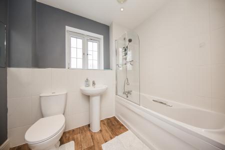BATHROOM: Panelled bath with shower over and additional handheld shower attachment, low level wc, pedestal wash hand basin with mixer tap, wall mounted chrome heated towel rail, fitted mirror, shaver point, wood effect flooring, part tiled walling and obscured window to rear.