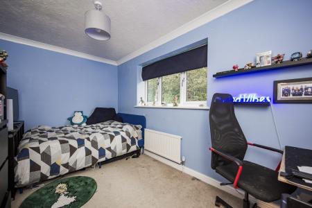 BEDROOM: Built-in double wardrobe cupboard, fitted carpet, radiator and window to rear with woodland views.